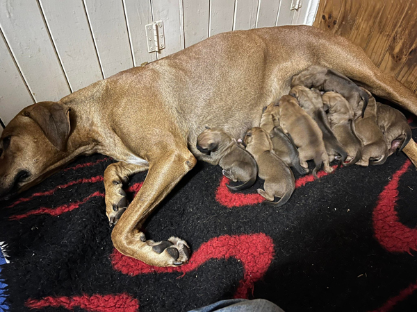 I was very concerned at this early labour so I chose to have a caesarean for her on Sunday night and she produced 10 healthy puppies.